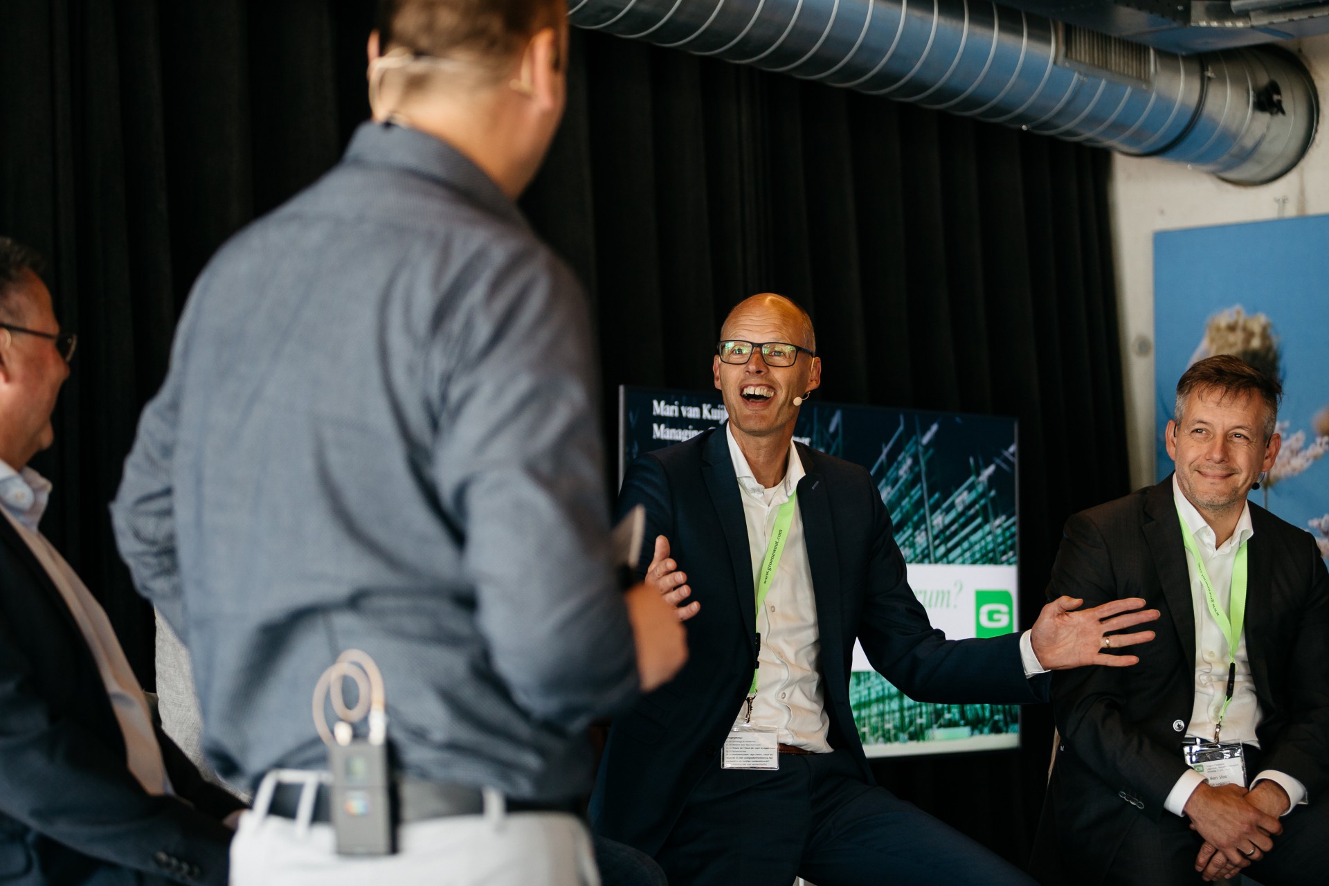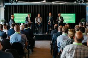Na de netwerkbreak was er tijd voor het paneldiscussie. Dijkhuizen legde de vier panelleden, Fred Groot (ERIKS Nederland), Ben Vos (Vos Logistics), Gerwin Vos (Somerset Capital Partners) en Jan van den Hogen (DEKA Immobilien) stellingen voor over o.a. de rollen, het risico en de rewards bij vastgoedontwikkeling.